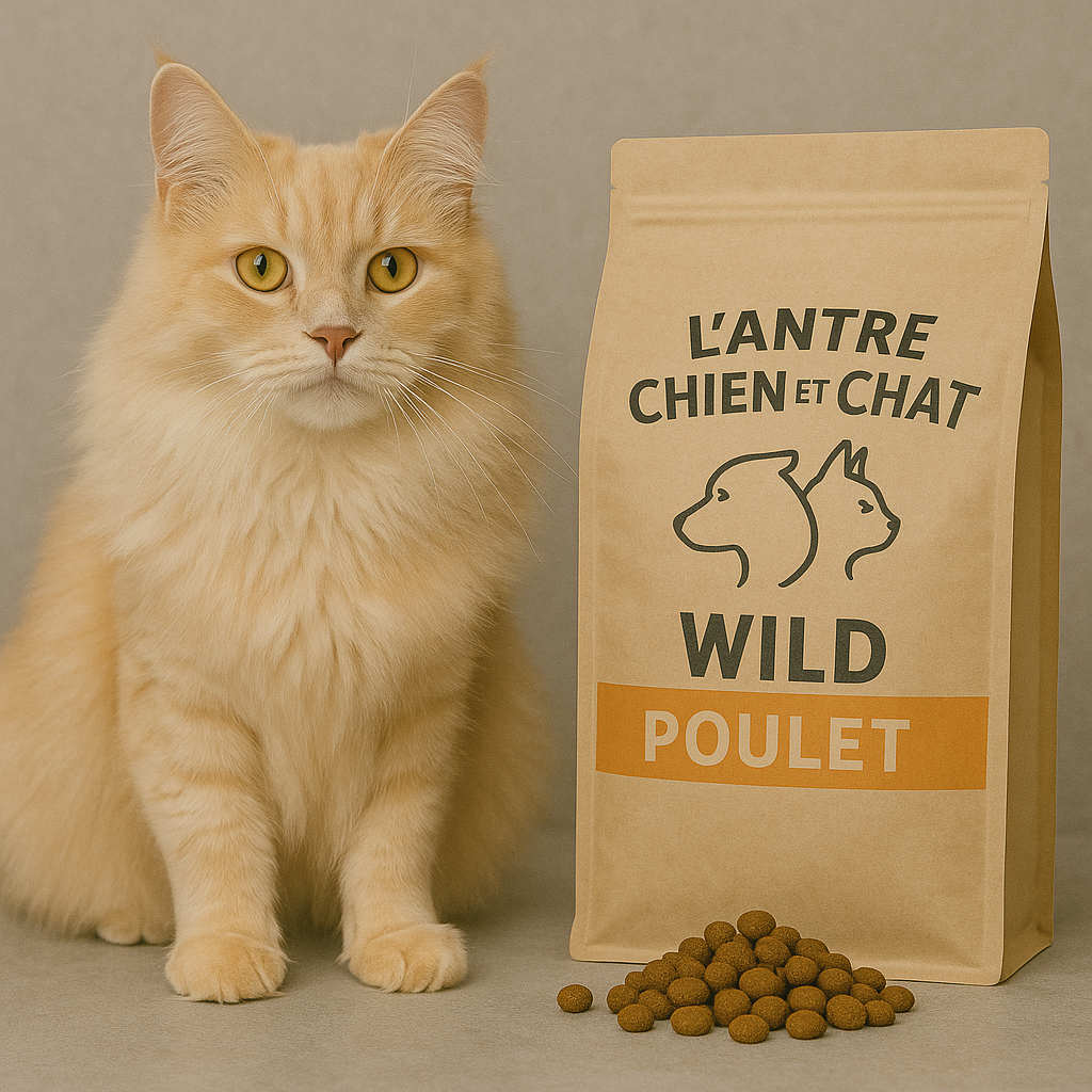 🐱 Wild Chat Poulet – L’alimentation sans céréales pour chats exigeants et sensibles Chez L’Antre Chien et Chat, nous savons que chaque chat mérite une nutrition adaptée à ses besoins spécifiques. C’est pourquoi nous avons créé Wild Chat Poulet, une recette riche en protéines, sans céréales, pour une alimentation naturelle, savoureuse et parfaitement digeste. 🍗 Du poulet : une protéine maigre et hautement digestible Le poulet est une source de protéines animales très bien tolérée par les chats, même les plus sensibles. Il offre : Une énergie de qualité pour les chats actifs Un soutien musculaire optimal Une appétence naturelle qui plaît même aux chats difficiles 🌾 Une recette sans céréales : digestion et confort intestinal Les céréales sont souvent mal tolérées par les chats, surtout ceux souffrant de sensibilités digestives ou de réactions cutanées. Notre recette est donc : 100 % sans céréales ni gluten Riche en fibres naturelles et prébiotiques pour un transit optimal Formulée pour réduire les risques d’allergies alimentaires 🌿 Une nutrition équilibrée pour une vie pleine de vitalité Formulée avec des légumes, vitamines et minéraux, Wild Chat Poulet soutient : Le système immunitaire Une peau saine et un pelage soyeux La santé rénale, grâce à un apport hydrique contrôlé et une teneur en minéraux adaptée 🇫🇷 Fabriquée en France avec amour et expertise Nous sélectionnons rigoureusement chaque ingrédient et produisons en France, pour vous garantir une traçabilité totale, une qualité constante et un impact local positif. 👩⚕️ Nos nutritionnistes sont à vos côtés Vous avez un doute sur le choix de croquettes pour votre chat ? Nos experts en nutrition animale sont disponibles pour vous guider et répondre à toutes vos questions. 📌 À découvrir dans notre boutique : https://www.lantrechienetchat.fr/boutique/WILD-CHAT-POULET-SANS-CEREALES-2-5KG-p525290173 👉 Wild Chat – Poulet Sans Céréales – Fabriqué en France